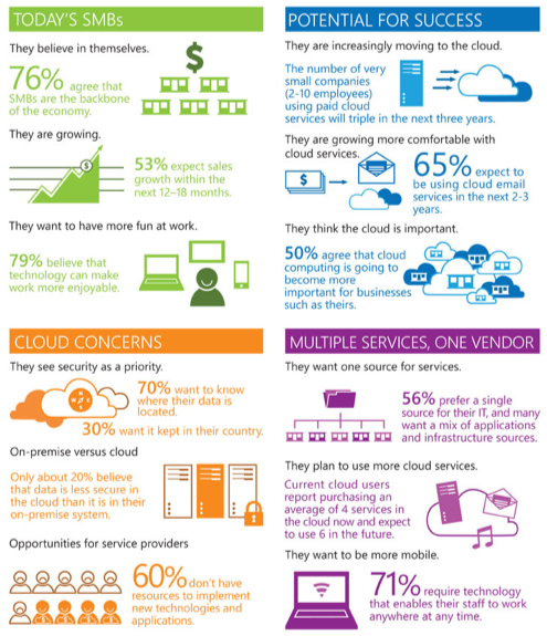 • Security is a priority but no longer a main concern. Only about 20 percent of SMBs believe that data is less secure in the cloud than it is in their on-premise systems. Thirty-six percent overall and 49 percent of larger SMBs actually think that data is as secure in the cloud as in their own systems.